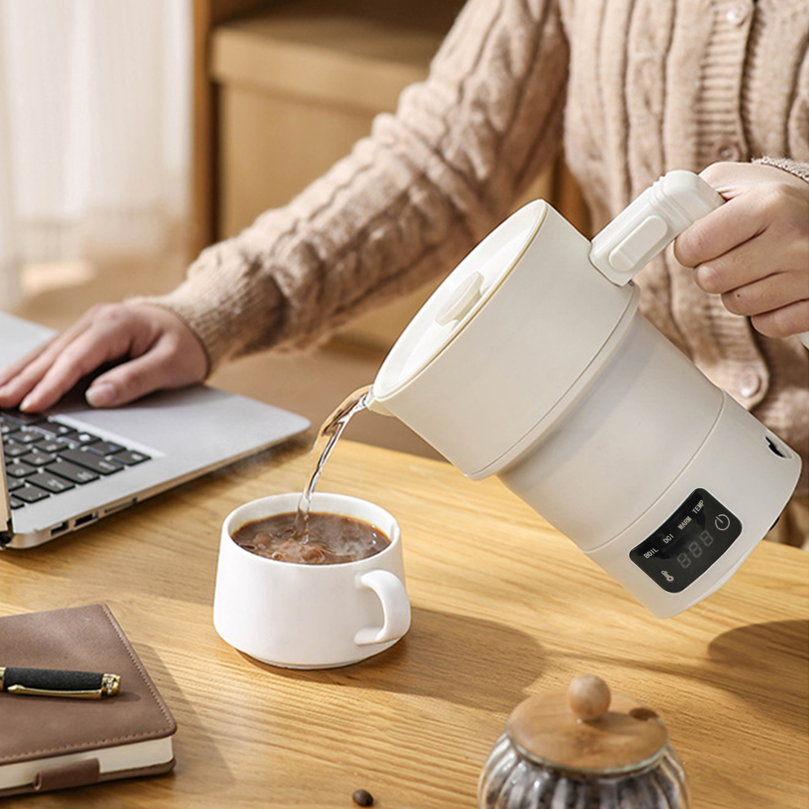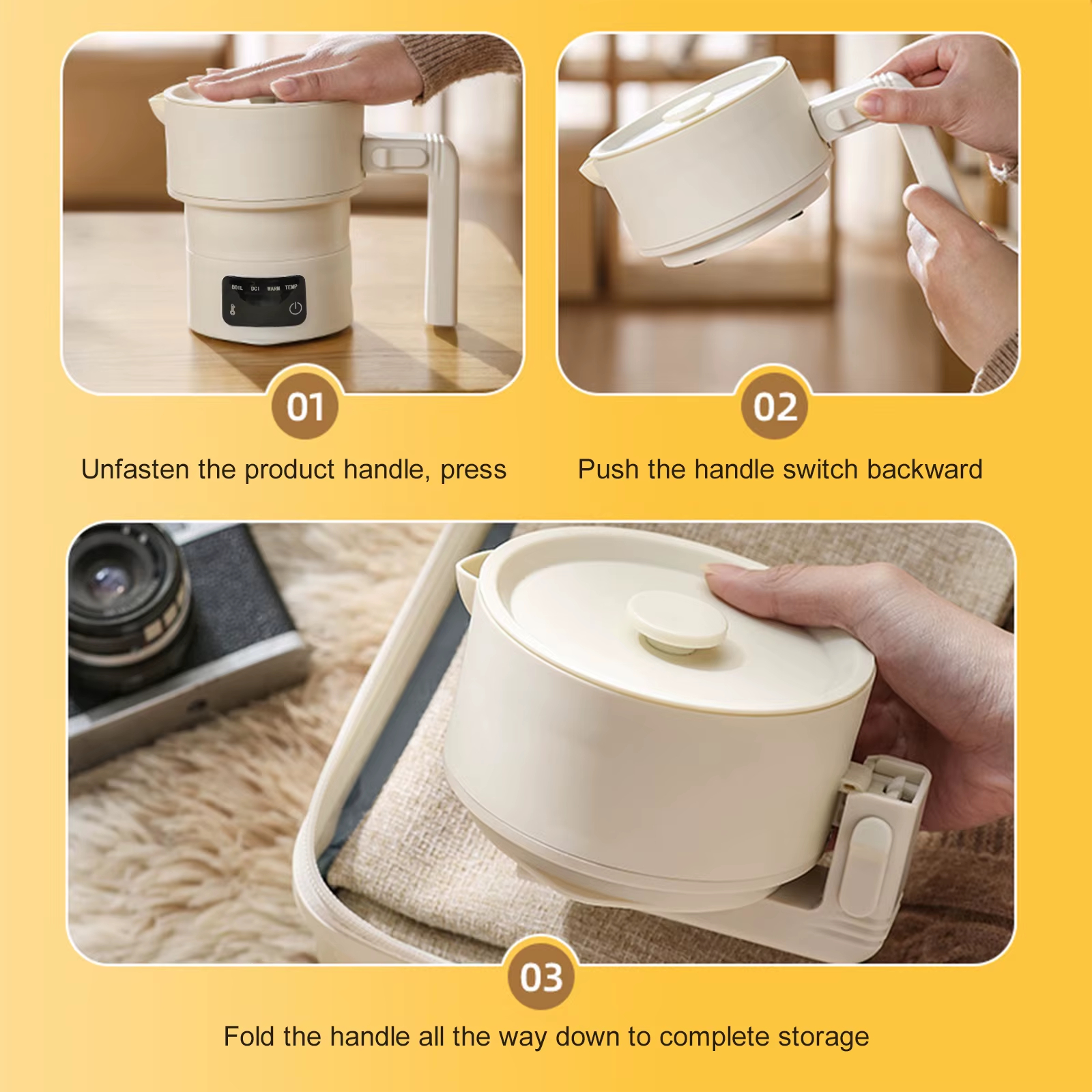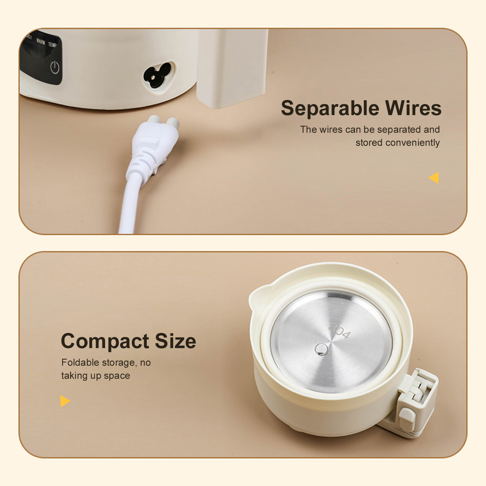وظيفة الغلاية والكوب 2.2 في 1:يعمل هذا الجهاز متعدد الاستخدامات كغلاية صغيرة وكوب، ويعمل كغلاية مياه، وكوب معكرونة فوري، ووعاء ساخن صغير، لتلبية الاحتياجات المختلفة للراحة أثناء السفر.