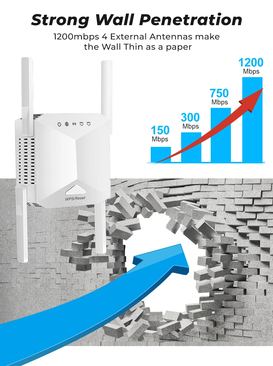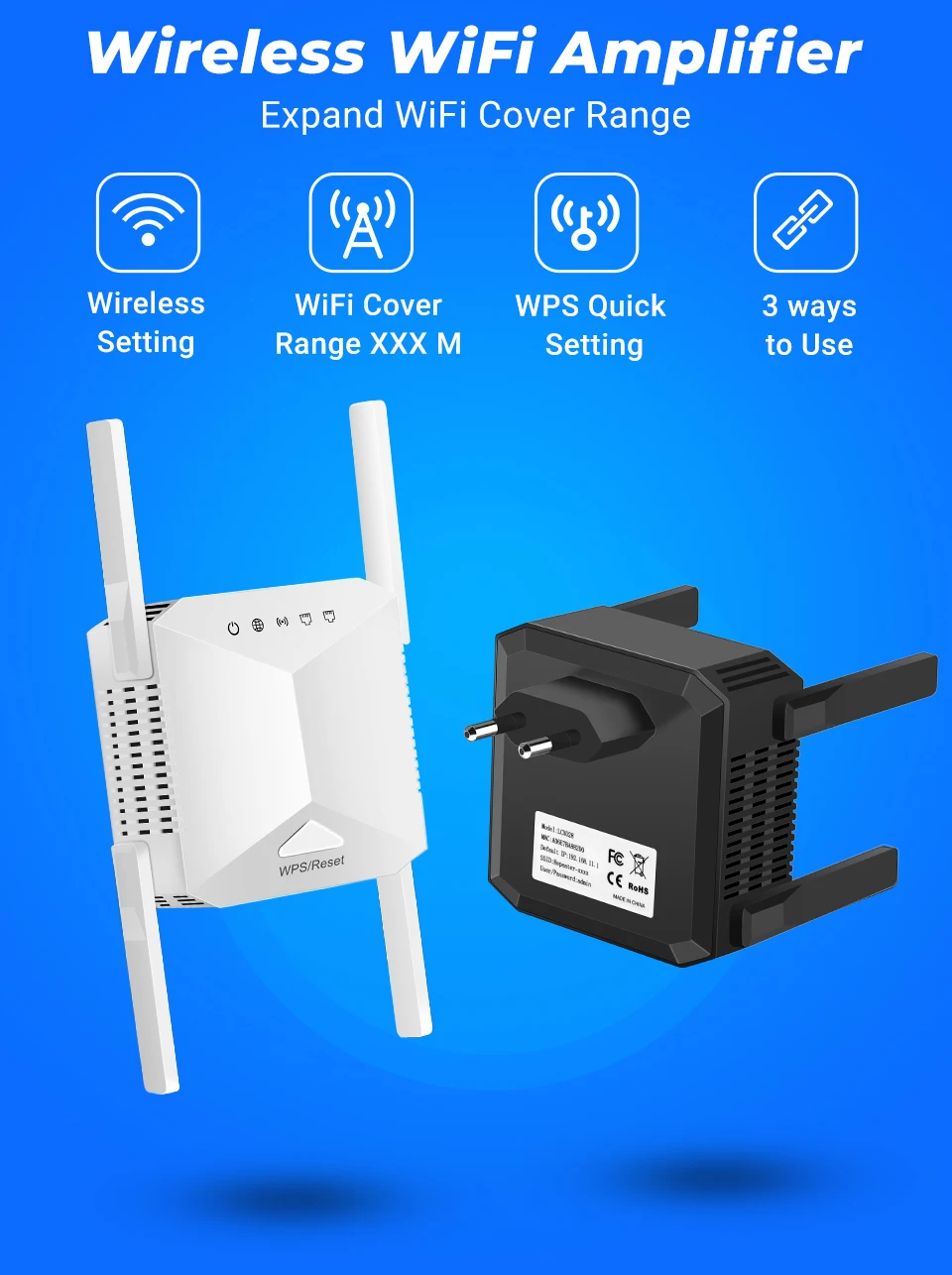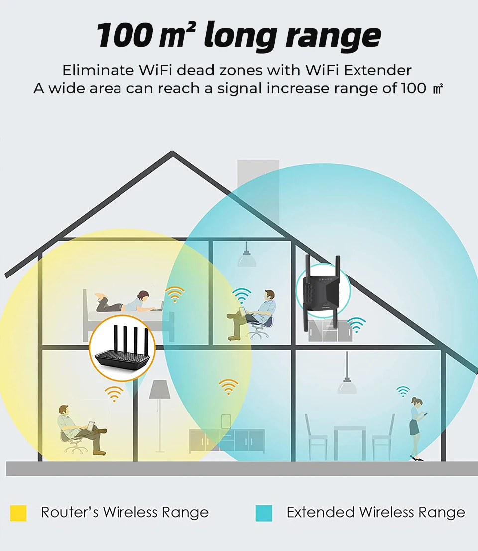 أربعة هوائيات خارجية: مُكرر إشارة الواي فاي مزود بأربعة هوائيات خارجية عالية الكسب، مما يُحسّن نطاق تغطية الواي فاي الحالية، ويُوسّع الإشارة اللاسلكية إلى حوالي 100 متر مربع.