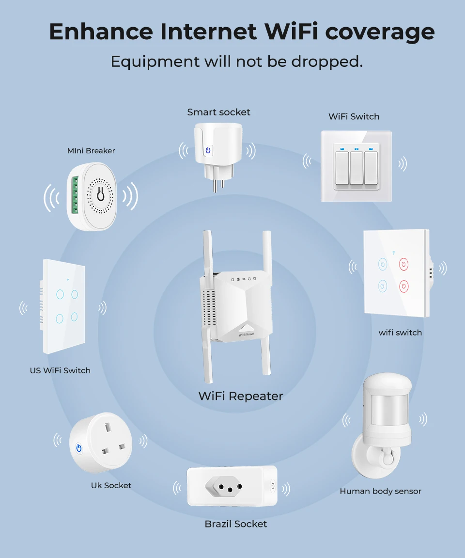 【توافق شامل】 يعمل مع أجهزة توجيه الإنترنت اللاسلكي 802.11b/g/n/a/ac، وهو مناسب لمعظم أجهزة التوجيه أو البوابات المتوفرة في السوق. يدعم توسيع نطاق التغطية ليشمل أي جهاز، مثل أجهزة iOS، وأجهزة Android، وأجهزة Samsung، وأجهزة Echo/Alexa، وأجهزة الكمبيوتر، وأجهزة PlayStation، والمقابس الذكية، وغيرها الكثير.