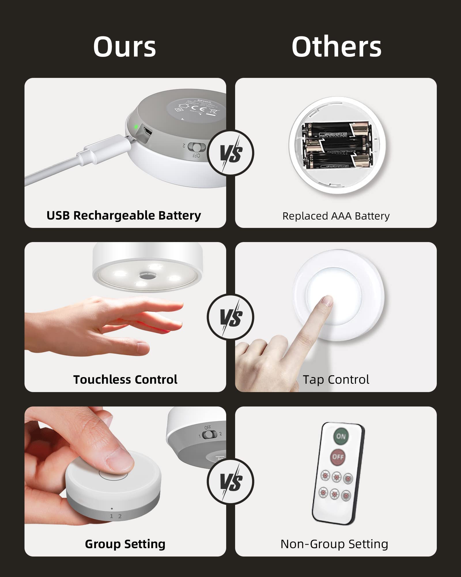 قابلة لإعادة الشحن وموفرة للطاقة: مع بطارية ليثيوم مدمجة بقدرة 2000 مللي أمبير في الساعة بدلاً من بطاريات AAA البديلة، تدوم مصابيح القرص هذه القابلة لإعادة الشحن لمدة 19 ساعة بأقصى سطوع.اشحن 3 مصابيح قرصية في نفس الوقت باستخدام كابل USB 3 في 1، مريحة للغاية وتوفير ما يصل إلى 80 بطارية خلية جافة AA سنويًا لكل مصباح خزانة.