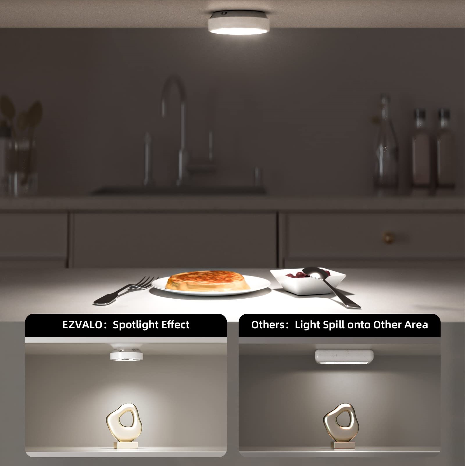 "طريقتان للتحكم في المجموعة" يمكن تخصيص مصابيح EZVALO Puck مع جهاز التحكم عن بعد إلى مجموعتين للتحكم المنفصل. من خلال مسح يدوي بسيط (في نطاق 1.2 بوصة) أو باستخدام جهاز التحكم عن بعد، يمكن ضبط جميع مصابيح LED في نفس المجموعة. خافتة وتشغيل/إيقاف في انسجام تام، لا حاجة للمس كل منها تحت إضاءة الخزانة بشكل فردي.