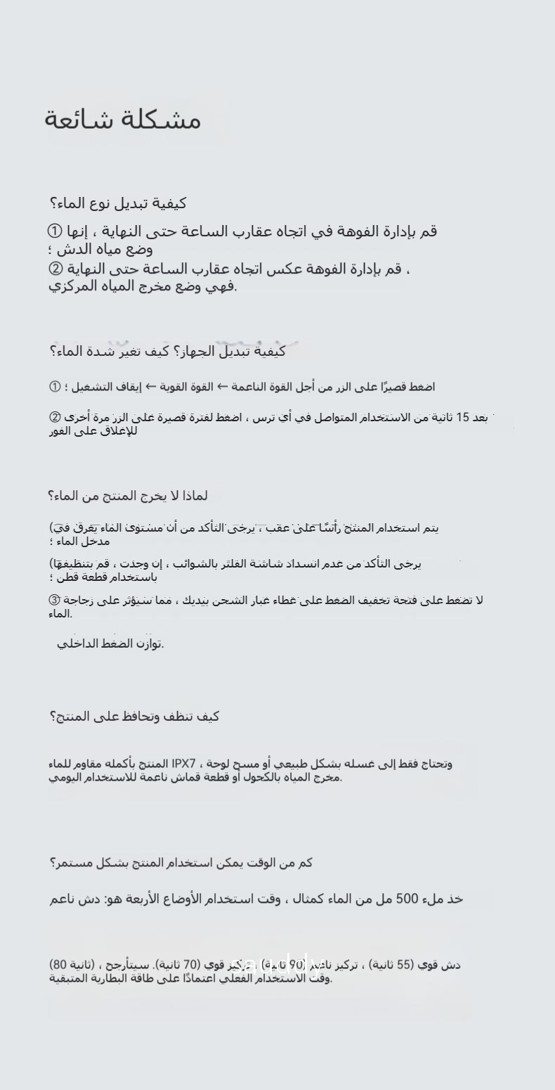 وضعان مخرج مياه: مركز(مخرج مياه بفتحة)/دش(مخرج مياه بـ 10 فتحات)
