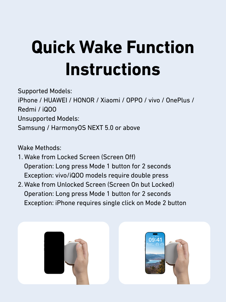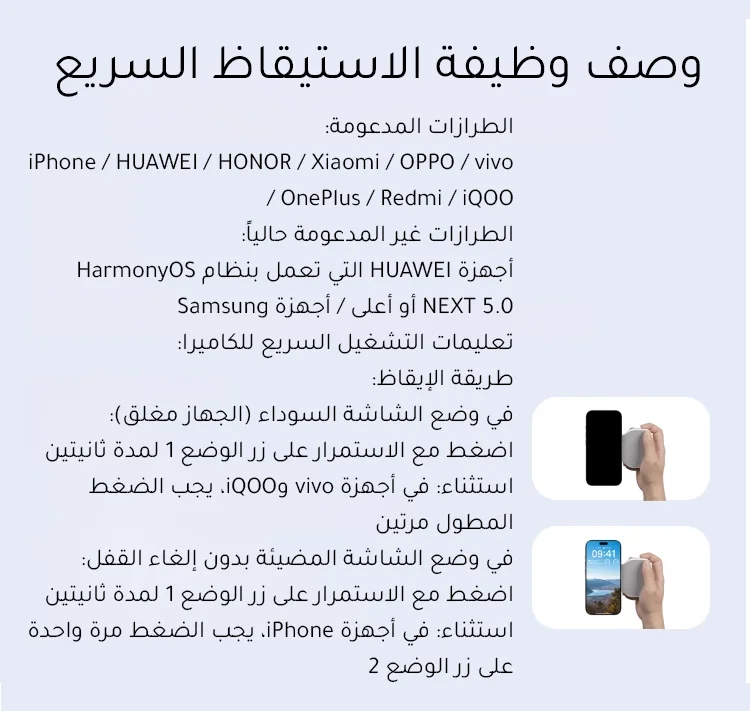 يعمل معآيفون، هواوي، شياومي، ممن لهم، فيفو(راجع التعليمات الخاصة بطرق الاستيقاظ).