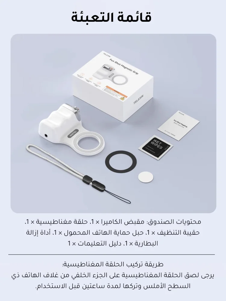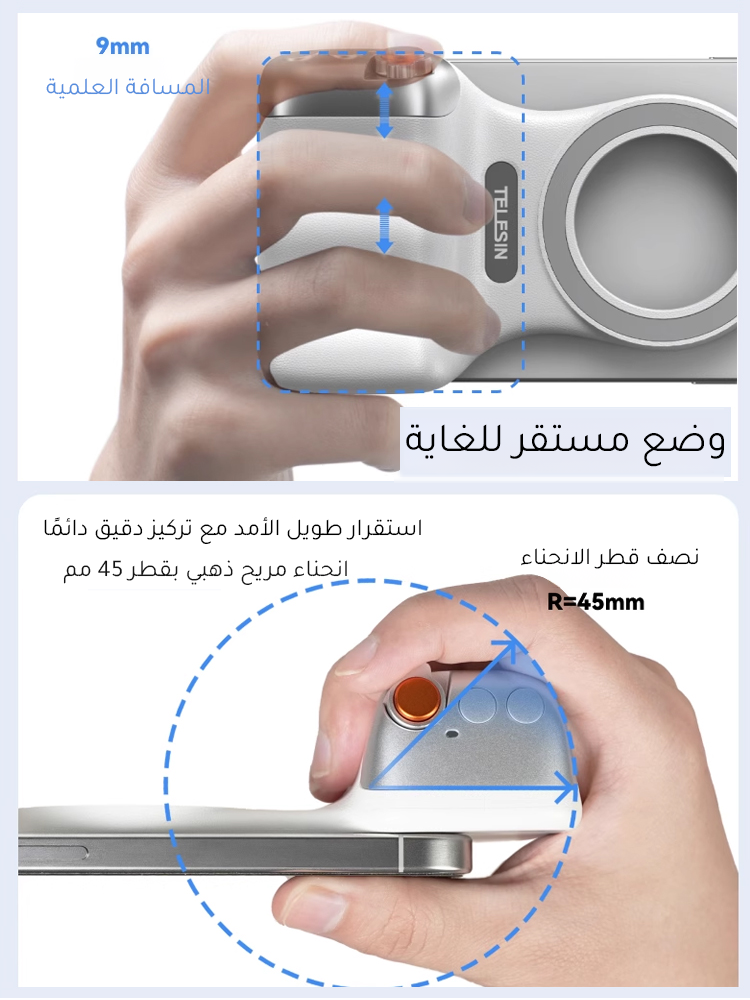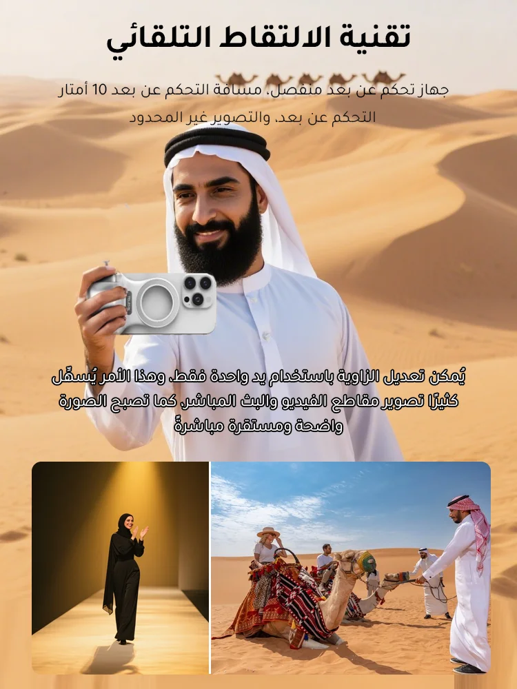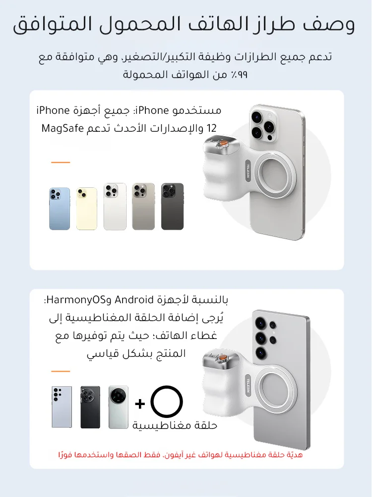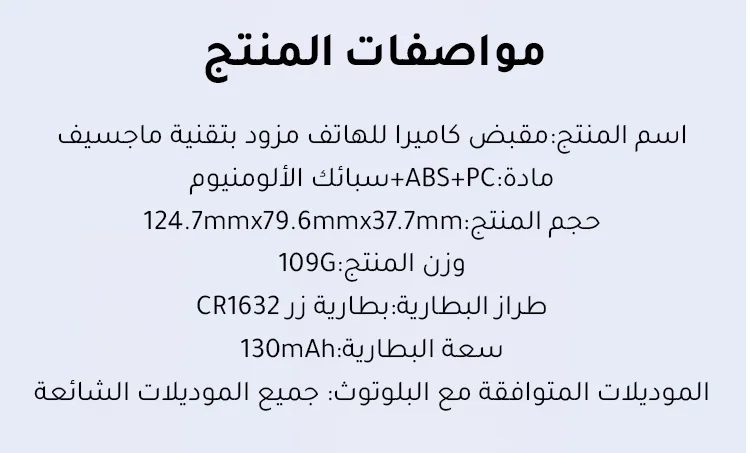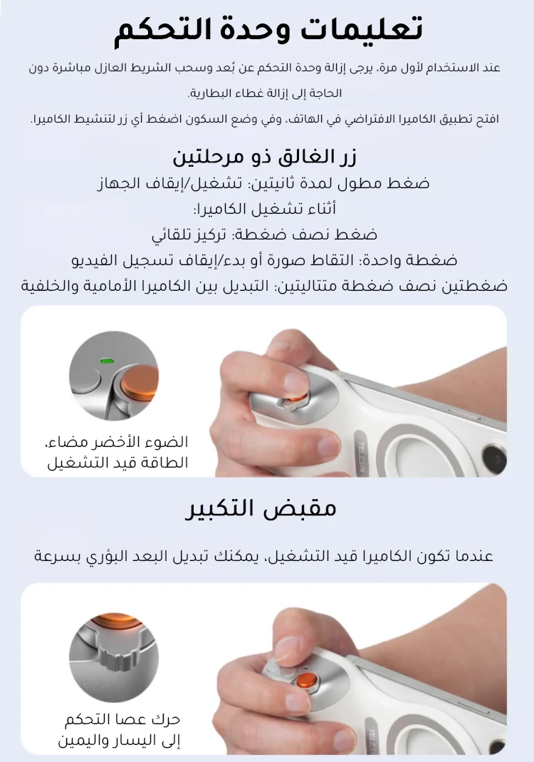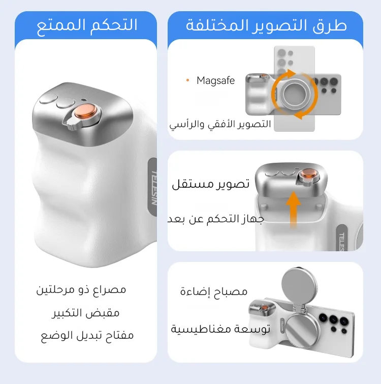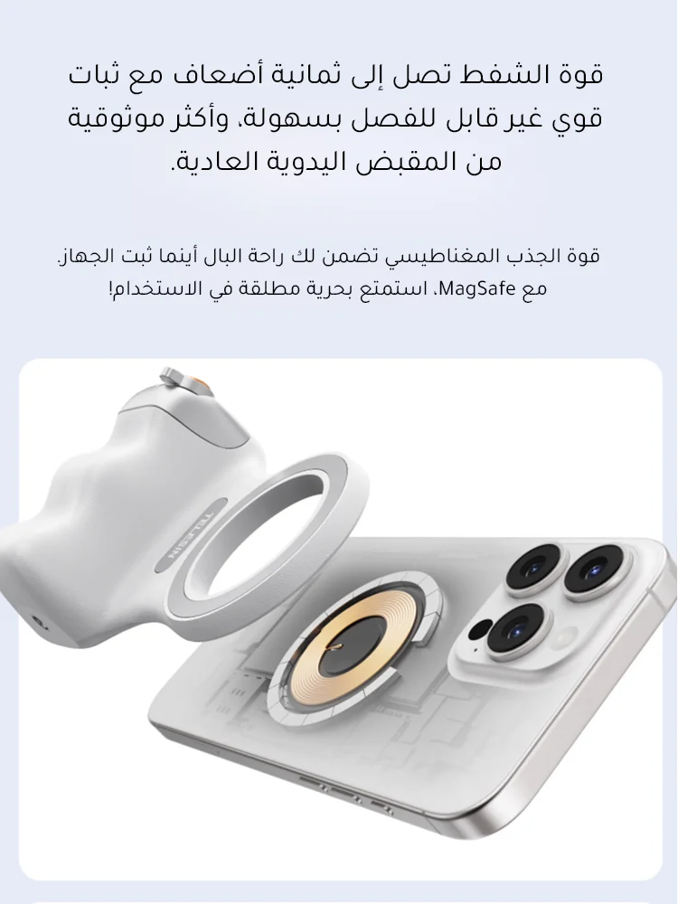 ✅8x قوة مغناطيسية قوية- يؤمن الهواتف (190-250 جم) بجاذبية مغناطيسية 2-3 كجم. ✅تصميم مريح– ويف فيت9™ تباعد الأصابع وPalmR45™ انحناء لقبضة خالية من التعب (معتمدة من ISO 9241-400). ✅ضوء ملء مغناطيسي مزدوج الجوانب- 3 درجات حرارة ألوان لالتقاط صور السيلفي أو الحياة الساكنة أو استخدام المرآة. ✅التحكم بيد واحدة- مصراع على مرحلتين، ورافعة تكبير، ومفتاح الوضع، والوصول السريع إلى الكاميرا. ✅وظيفة الاستيقاظ السريعمتوافق مع iPhone وHuawei وXiaomi والمزيد (باستثناء Samsung). ✅عمر البطارية 10 أشهربطارية CR1632 منخفضة الطاقة بسعة 130 مللي أمبير في الساعة. ✅محمولة وخفيفة الوزن- وزن 109 جرام، وانحناء 45 ملم لراحة راحة اليد. ✅360° حرية الرماية- جهاز تحكم عن بعد قابل للفصل، ومفتاح أفقي/عمودي، وتوافق MagSafe.