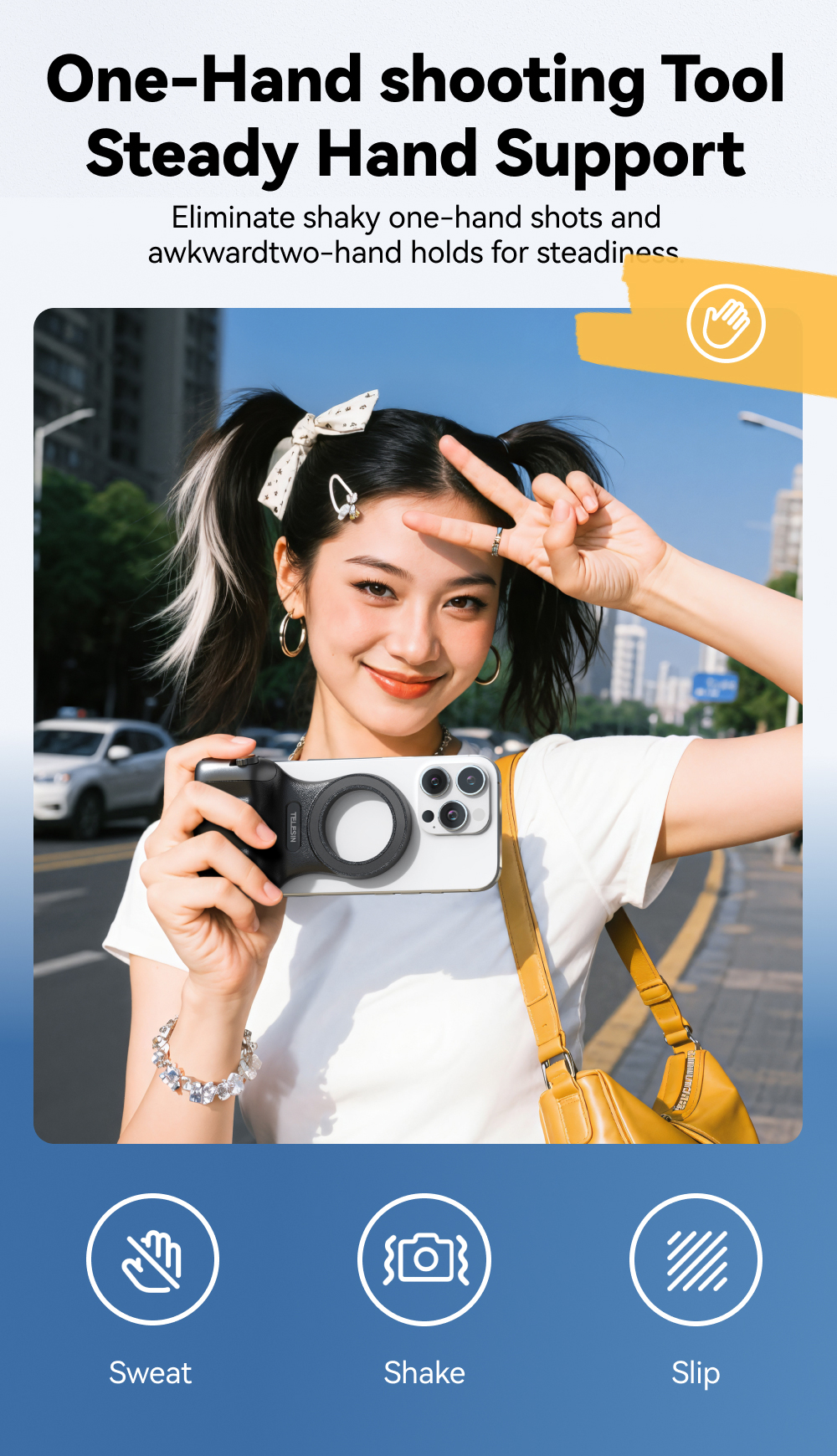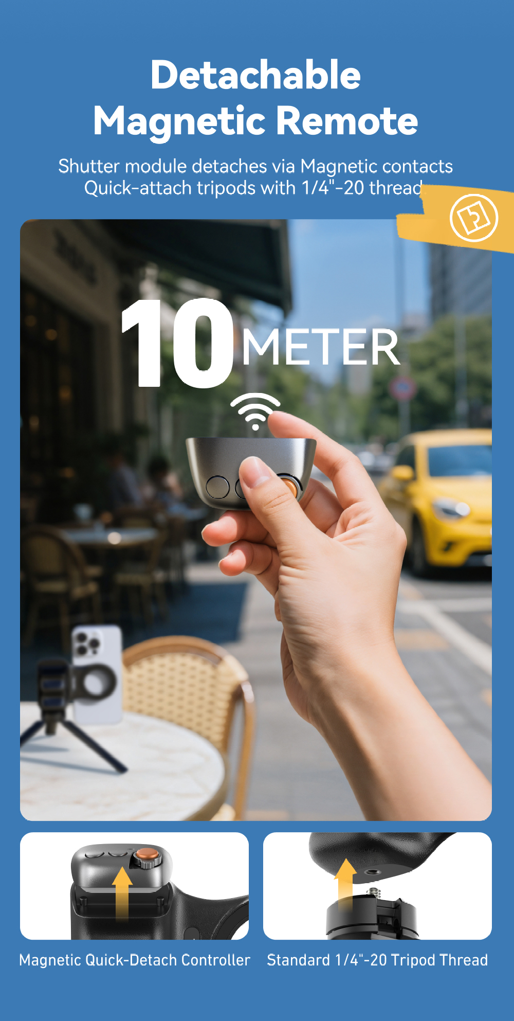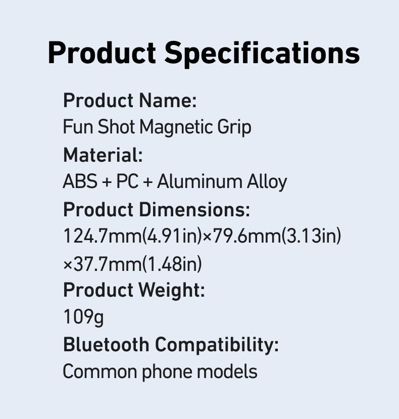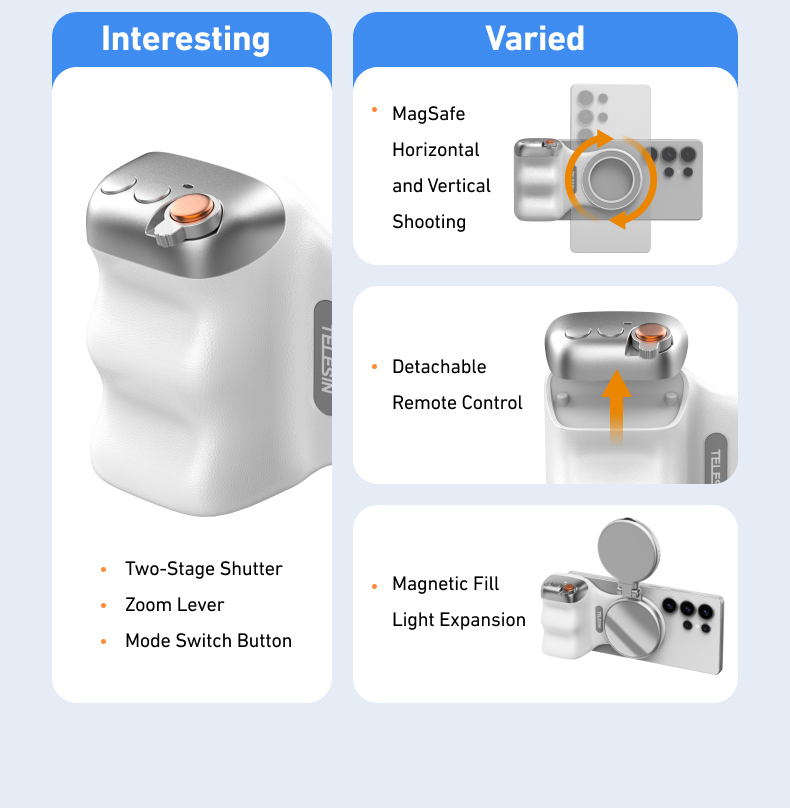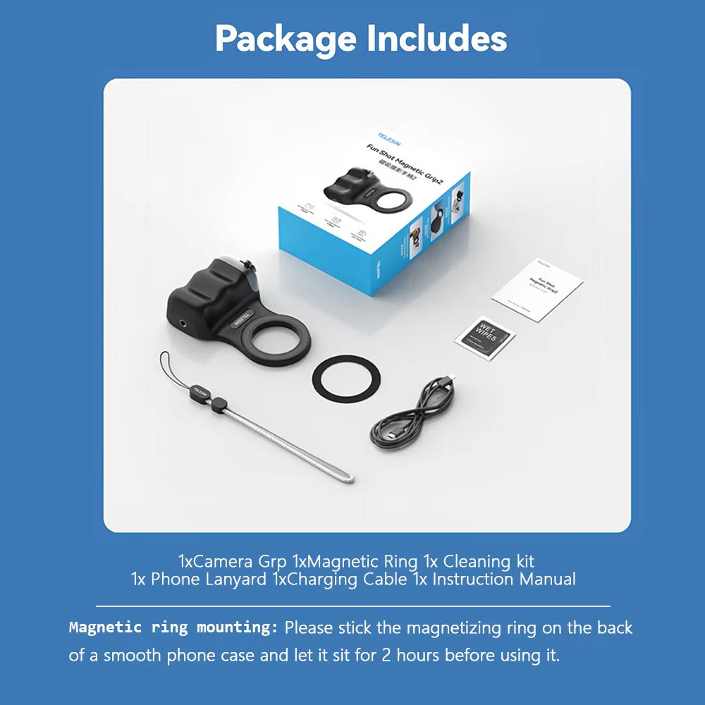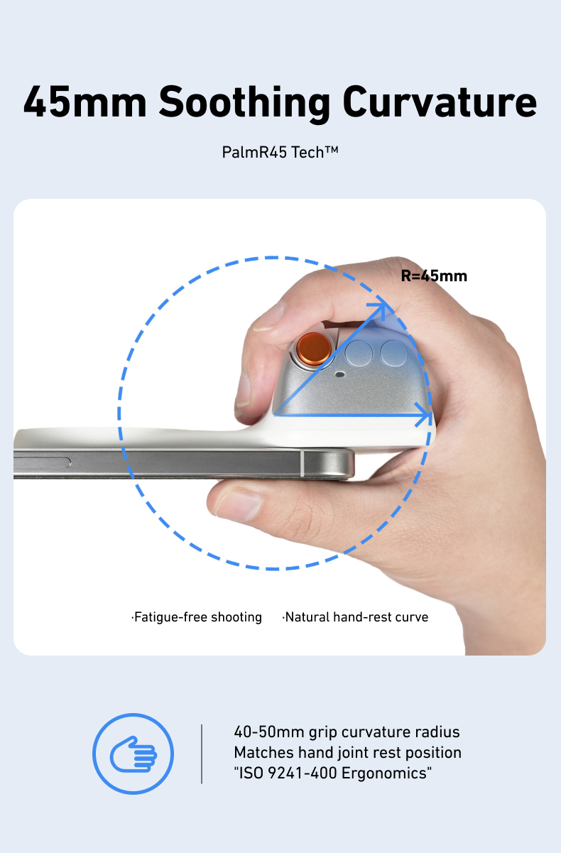 ✅8x قوة مغناطيسية قوية- يؤمن الهواتف (190-250 جم) بجاذبية مغناطيسية 2-3 كجم. ✅تصميم مريح– ويف فيت9™ تباعد الأصابع وPalmR45™ انحناء لقبضة خالية من التعب (معتمدة من ISO 9241-400). ✅ضوء ملء مغناطيسي مزدوج الجوانب- 3 درجات حرارة ألوان لالتقاط صور السيلفي أو الحياة الساكنة أو استخدام المرآة. ✅التحكم بيد واحدة- مصراع على مرحلتين، ورافعة تكبير، ومفتاح الوضع، والوصول السريع إلى الكاميرا. ✅وظيفة الاستيقاظ السريعمتوافق مع iPhone وHuawei وXiaomi والمزيد (باستثناء Samsung). ✅عمر البطارية 10 أشهربطارية CR1632 منخفضة الطاقة بسعة 130 مللي أمبير في الساعة. ✅محمولة وخفيفة الوزن- وزن 109 جرام، وانحناء 45 ملم لراحة راحة اليد. ✅360° حرية الرماية- جهاز تحكم عن بعد قابل للفصل، ومفتاح أفقي/عمودي، وتوافق MagSafe.